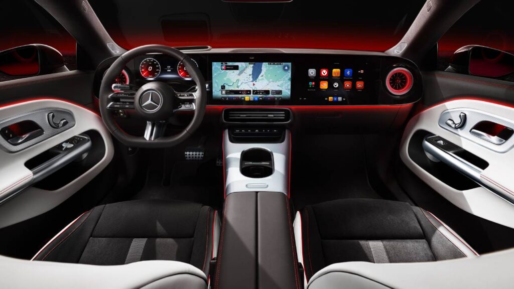 Tüm CLA modellerinde geniş bir panoramik tavan bulunuyor. Tek parça sabit cam tavan, ön cam çerçevesinden arkaya kadar kesintisiz bir şekilde uzanıyor. Bu tasarım, yukarıya doğru neredeyse engelsiz bir görüş sağlayan yeni bir iç mekân deneyimi sunuyor. Bu cömert alan hissi, dijital zarafetle tamamlanıyor. Havada süzülüyor gibi görünen MBUX Superscreen, iç mekânın tüm genişliği boyunca uzanıyor. Geniş cam yüzeyin arkasında 26 santimetre (10,25 inç) sürücü ekranı, 35,6 santimetre (14 inç) merkezi ekran ve 35,6 santimetre (14 inç) ön yolcu ekranı bulunuyor. Tüm ekranlar, Unity Game Engine’in son teknoloji ürünü, yüksek performanslı çipleri ve gerçek zamanlı grafikleri ile çalışıyor.